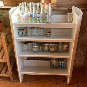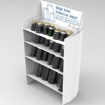 El desarrollo inició con la definición de los tamaños de frascos que serían recolectados y con el análisis de las posibles configuraciones del dispositivo para evitar quebraduras y desorden. Se optó por la morfología de estante con repisas inclinadas hacia atrás para estabilizar los frascos. Se realizaron prototipos en cartón corrugado para validar la geometría y la resistencia. A pesar de que el cartón corrugado tiene un bajo impacto ambiental por metro cuadrado, su baja durabilidad lo amplía varias veces, sobre todo en comparación con otros materiales mucho más resistentes a la humedad y a los golpes. Así que el desarrollo final se fabricó en lámina de polipropileno celular reciclable. Se realizaron pruebas de uso y durabilidad para validar el producto. Se agregó un superficie frontal opcional para comunicar el propósito del estante e identificar la institución gestora del proyecto.