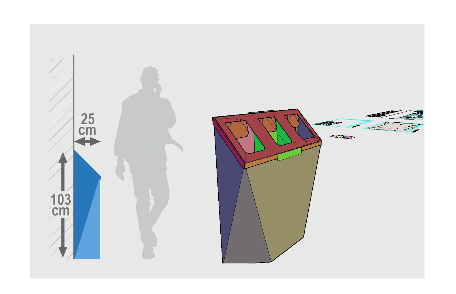 El diseño integra la función de recolección de tres materias en el mismo recipiente, para eliminar los costos de superficies divisorias internas redundantes, lo que optimiza el uso de los materiales y reduce su impacto ambiental. En un primer diseño se usó cartón corrugado para fabricar el recipiente, sin embargo la exposición de los pasillos de escuelas al rocío durante la temporada lluviosa deterioraría el producto rápidamente. Se definió entonces usar la lámina de polipropileno celular como mejor alternativa, por su resistencia al ambiente y su reciclabilidad. La geometría prismática del recipiente ofrece resistencia, un volumen aerodinámico y un lenguaje estético atractivo. Posteriormente se determinó que ciertos edificios requieren un acabado más elegante para oficinas administrativas, hoteles, aeropuertos, etc. Así que se diseñó una versión en lámina de acero inoxidable AISI 304 con una vida útil de más de 20 años. Esto lo hace un producto de bajo impacto ambiental a parte de que no requiere ni soldadura ni pintura.